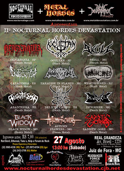 Sadistic Gore-(MG), Autumn Flowers-(MG), Wrathorned-(RJ), Paradise In Flames-(MG), Ocultan-(SP), Catacumba-(ES), Delicta Carnis-(ES), Oligarquia-(SP), Black Widow-(MG), Devourer-(MG),