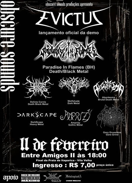 Sadistic Gore-(MG), Autumn Flowers-(MG), Wrathorned-(RJ), Paradise In Flames-(MG), Ocultan-(SP), Catacumba-(ES), Delicta Carnis-(ES), Oligarquia-(SP), Black Widow-(MG), Devourer-(MG),